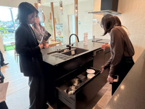 まずキッチンでは「リシェル」や「ノクト」を中心に体感。セラミックトップの質感や耐久性だけでなく、収納の使い方や動線設計など、日々の使いやすさが徹底的に考えられている点が印象的でした。実際に引き出しを開け、収納量や動きのスムーズさまで細かく確認しています。