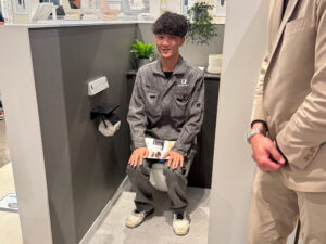 「サティス」シリーズに実際に座ることで、まるでソファに腰掛けたような快適性能を体感。デザイン性はもちろん、清掃性や節水性など、日々のストレスを軽減する工夫が詰まっていることを実感しました。